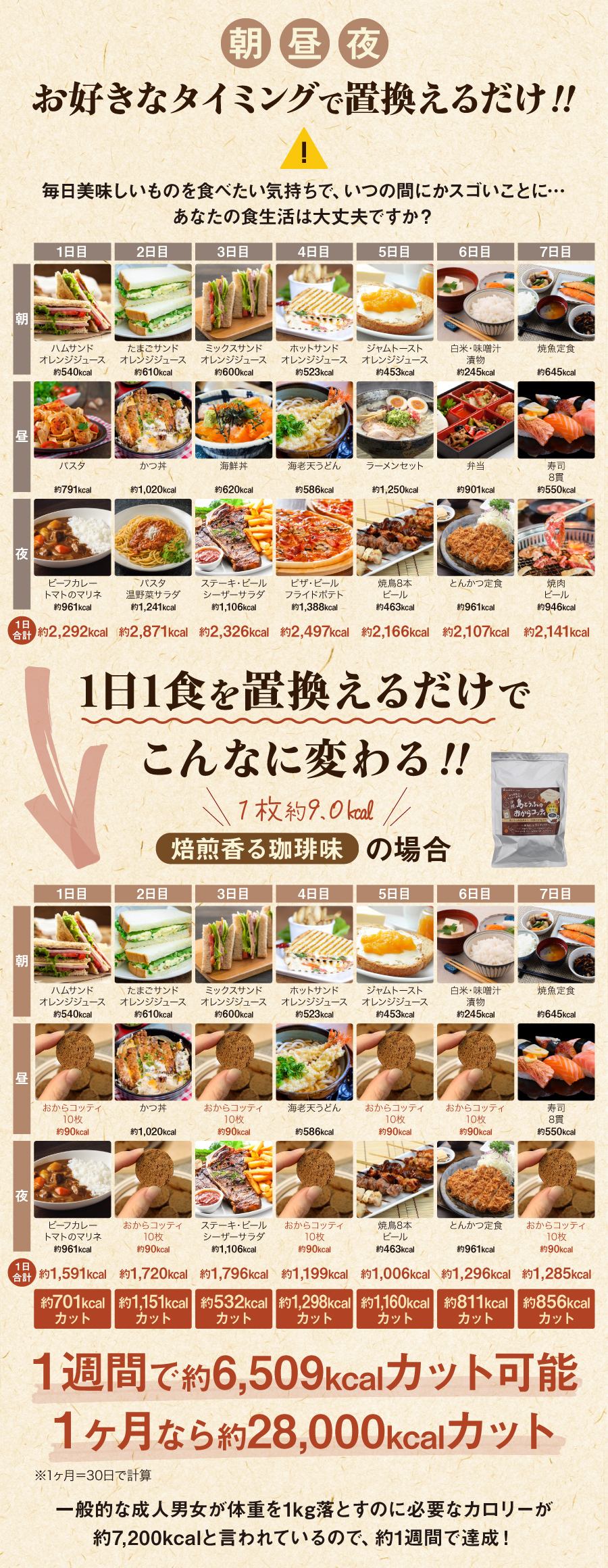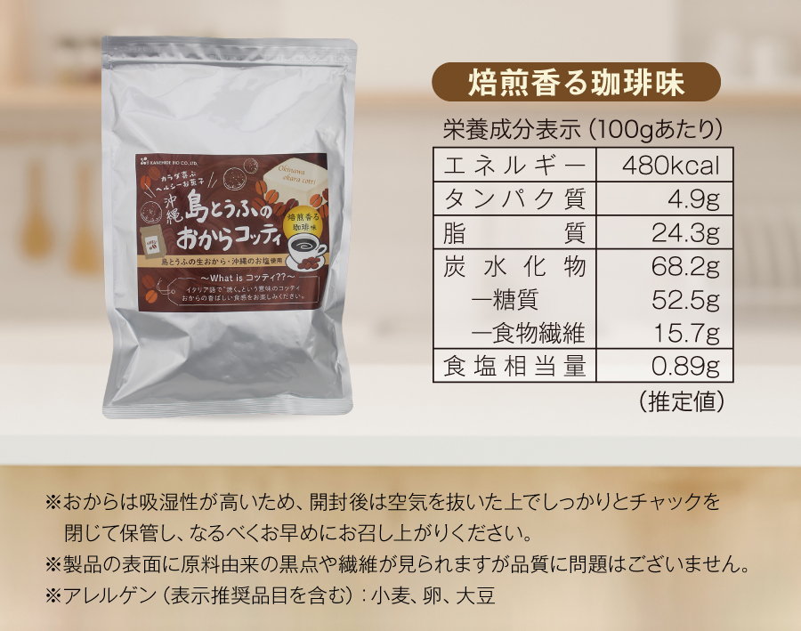 | 原材料名 | おから(国内製造)、砂糖、小麦粉、ショートニング、液卵、インスタントコーヒー、レギュラーコーヒー、食塩/ベーキングパウダー、(一部に小麦・卵・大豆を含む) |